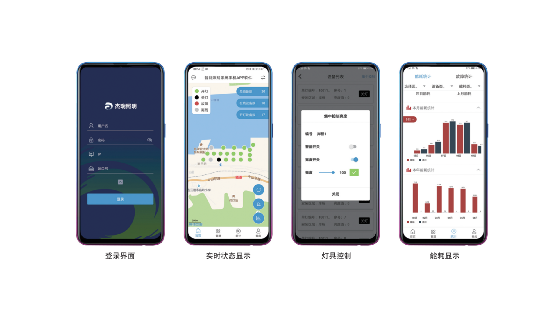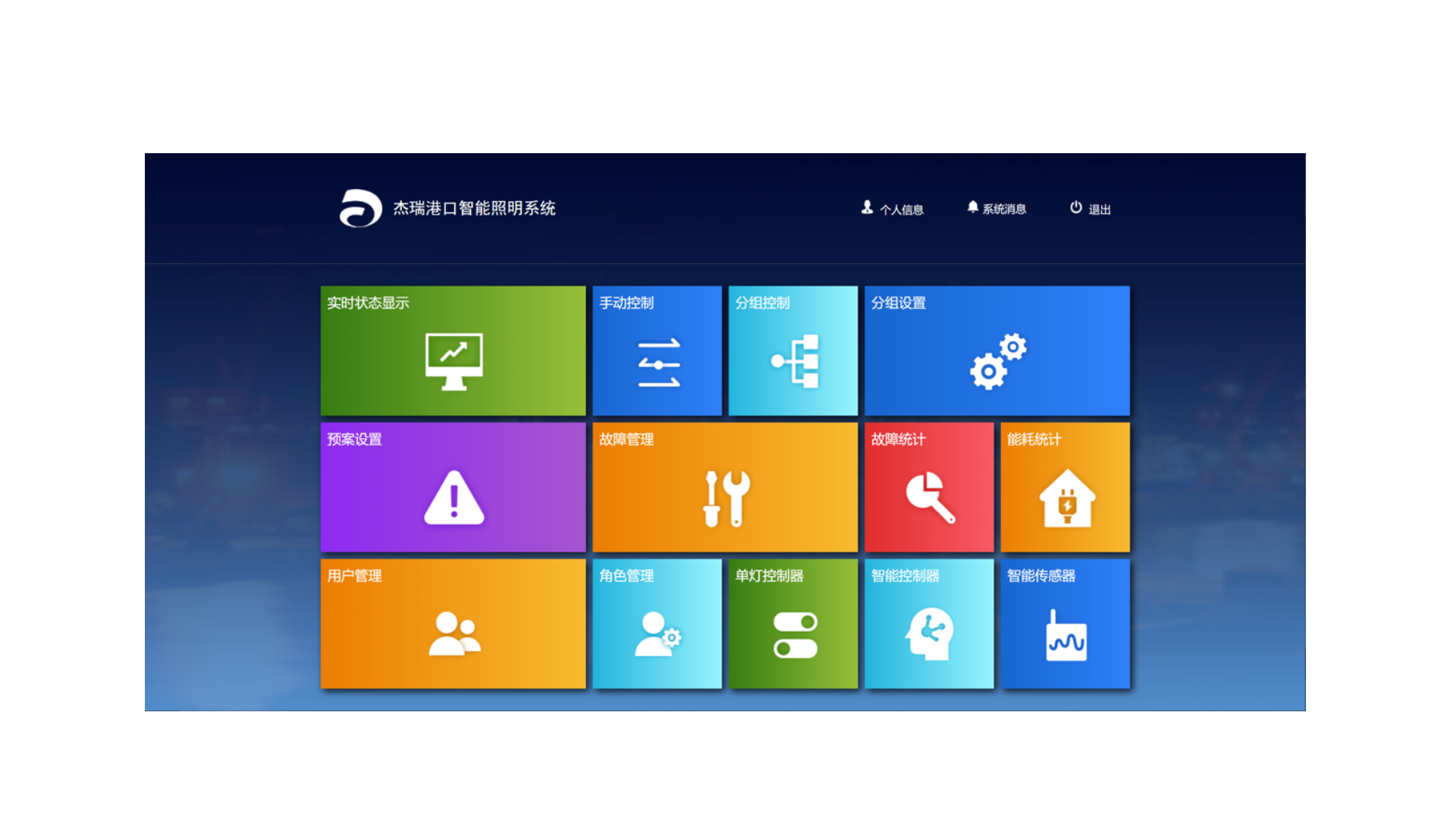 杰瑞智慧照明系统JR-LCS-Smart2000是杰瑞针对港口岸桥和堆场、厂房等作业区域的照明特点,利用云计算、大数据、人工智能、视频检测、嵌入式与物联网等技术设计开发的全新一代自适应智慧照明系统。系统具备智能控制和高效节能两大特点,实时感知作业区域内的人、车、环境,支持与九游体育(中国)生产调度系统对接,实现作业区域内的自适应照明,达到高效节能目的。系统兼具灯具状态实时显示、灯具故障实时推送、能耗大数据实时统计、控灯预案自主可调等多种功能,满足九游体育(中国)对照明系统的精细化管理。系统包含:智能照明管理平台、智能灯具控制器、高稳定性LED灯具(内含单灯控制器)、高精度传感器等一整套软硬件设备,同时拥有桌面Web端和手机端两种管理方式。